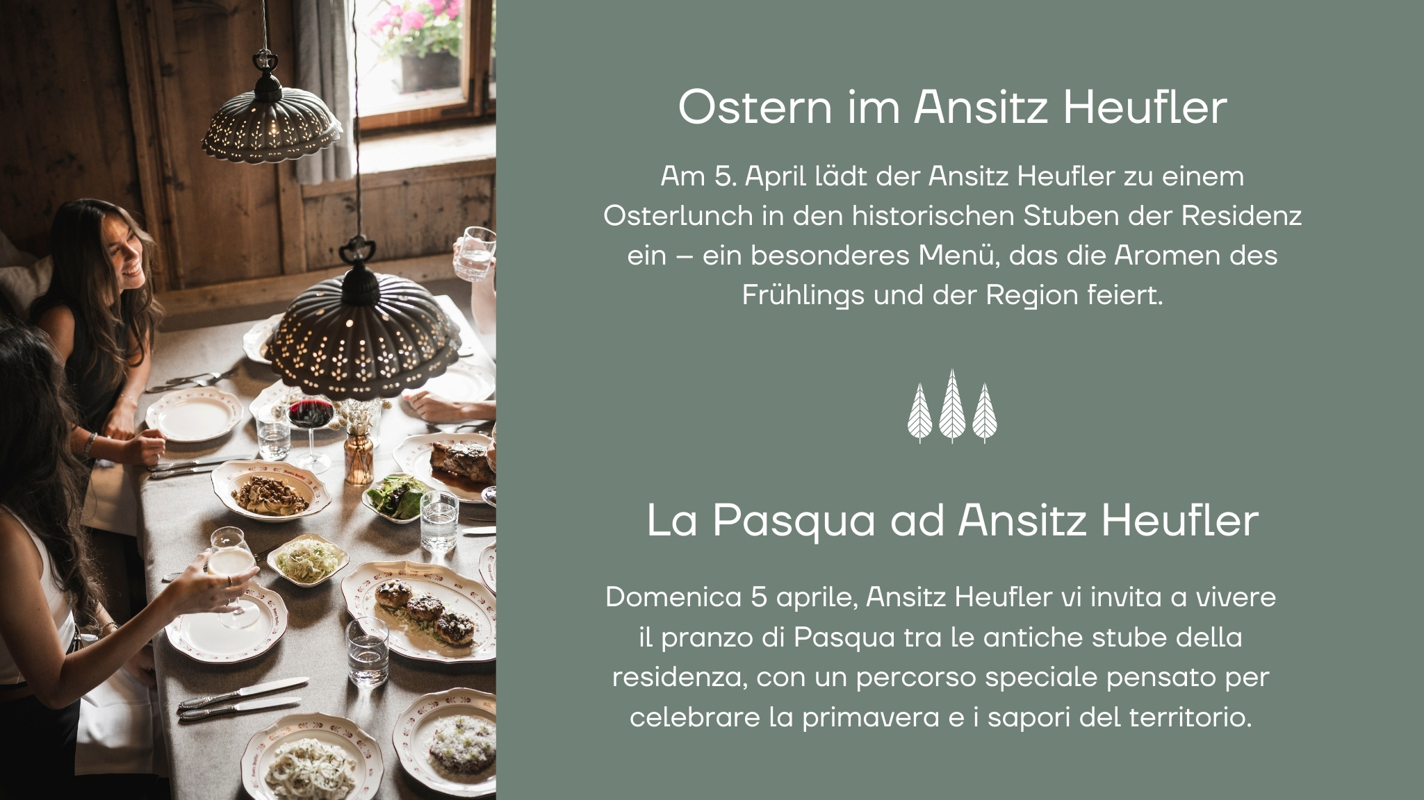 Raccogliamo attimi preziosi da condividere. Ogni evento ad Ansitz Heufler è un’occasione per vivere la casa e il territorio con intensità e autenticità. Dai piccoli incontri alle feste più intime, dalle esperienze di degustazione alle attività all’aria aperta, ogni momento racconta una storia da custodire. Fatevi coinvolgere dalle stagioni, dai sapori e dalle emozioni che solo questo angolo delle Dolomiti sa offrire.