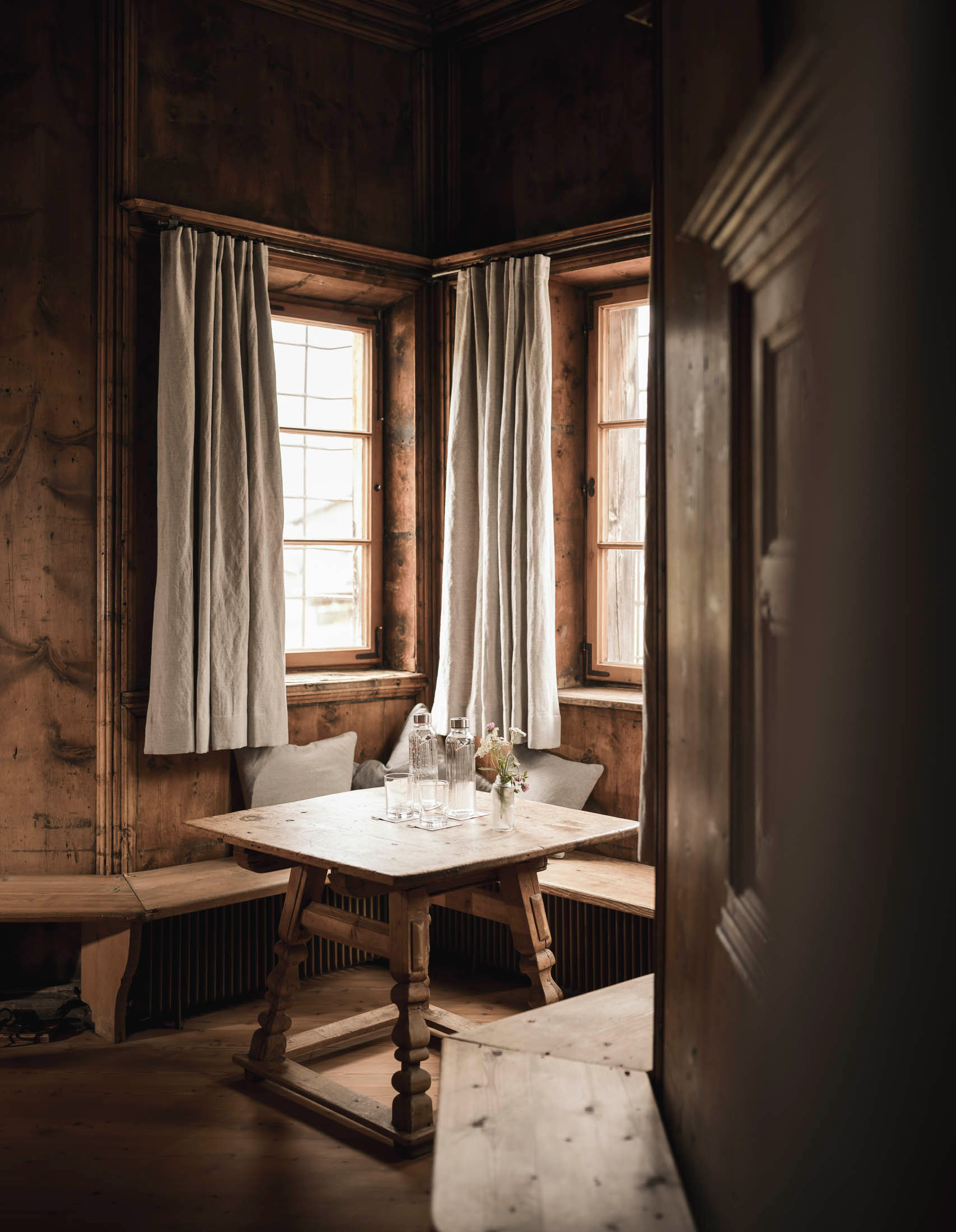 Camere matrimoniali raccolte e accoglienti, dove il soffitto con travi a vista dona calore e autenticità. I pavimenti in parquet di legno di larice e i soffitti o travi in legno di cirmolo custodiscono la memoria di queste mura storiche, creando un rifugio intimo e autentico.